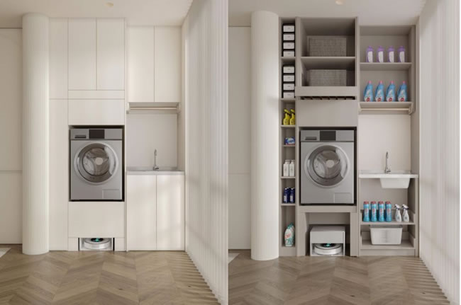 1㎡家政柜,针对小空间痛点,创新设计5大功能、14个模块,集洗涤、护理、收纳、清洁多功能于一体,打造理想居家生活方式,被观众评价为“小户型的空间救星”。各功能模块可自由组合搭配,科学合理分区,美观又实用。