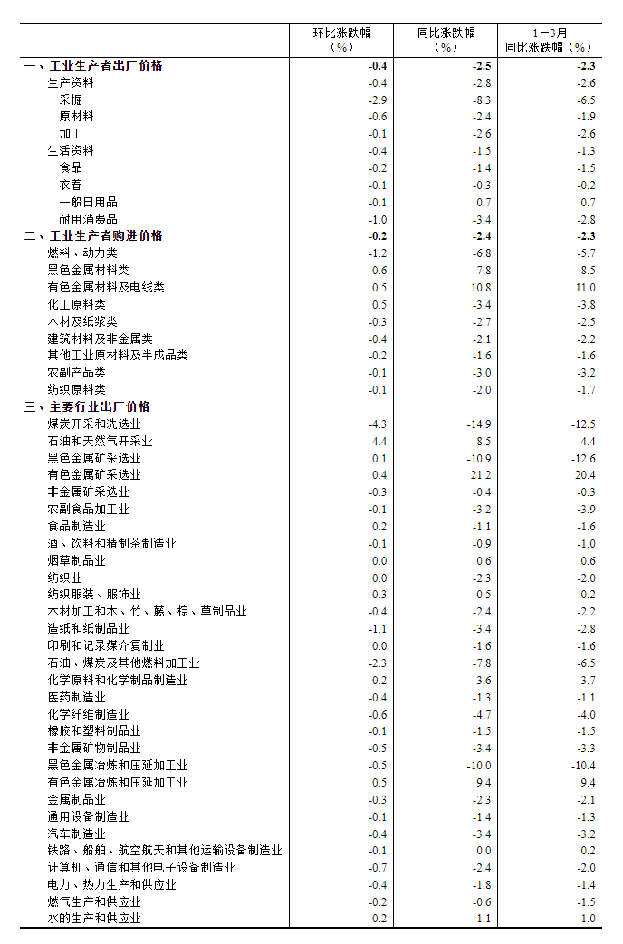 3月份,工业生产者出厂价格中,生产资料价格下降0.4%,影响工业生产者出厂价格总水平下降约0.30个百分点。其中,采掘工业价格下降2.9%,原材料工业价格下降0.6%,加工工业价格下降0.1%。生活资料价格下降0.4%,影响工业生产者出厂价格总水平下降约0.11个百分点。其中,食品价格下降0.2%,衣着和一般日用品价格均下降0.1%,耐用消费品价格下降1.0%。