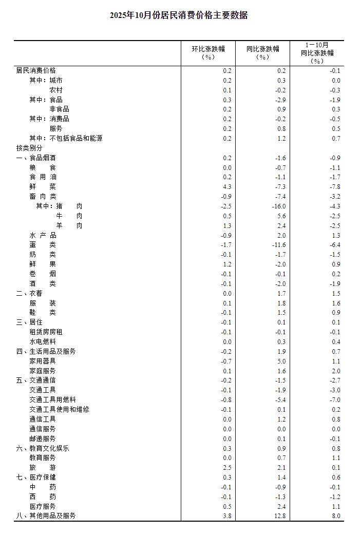 2025年10月份居民消费价格同比上涨0.2%