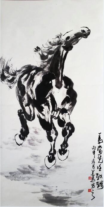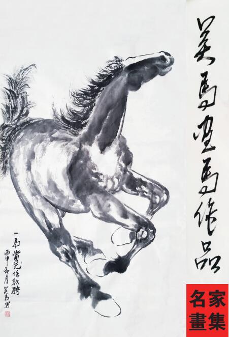 徐悲鸿是画马驰名的大家,他的骏马画,英俊豪放,独创一格,既有传统画马的功底,又吸收了西画的长处,为近现代画马的发展开辟新蹊径。在他笔下,一匹匹奔马奋踪扬蹄,在广袤的土地上飞奔,英姿飒爽,神态各异。有的腾空起飞,有的蹄下生烟,有的回首顾盼,有的一往直前,仿佛都要破纸而出。都说画马难画骨,徐先生不仅画出了马骨,更画出了马的神。