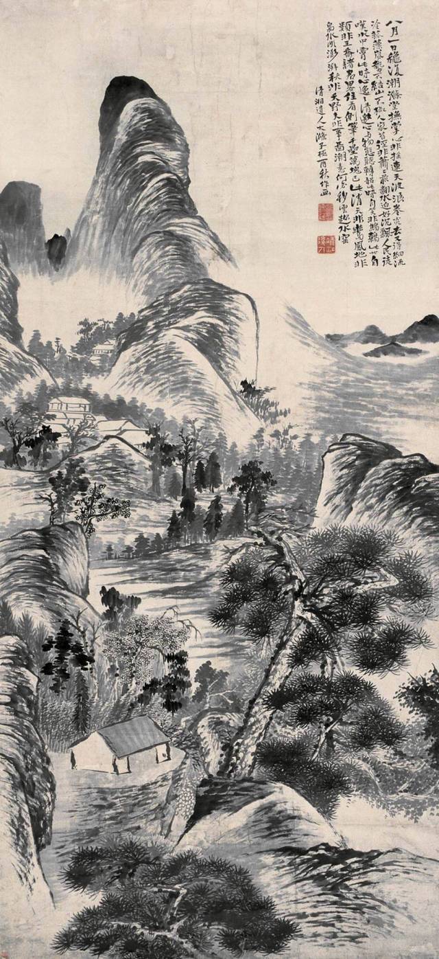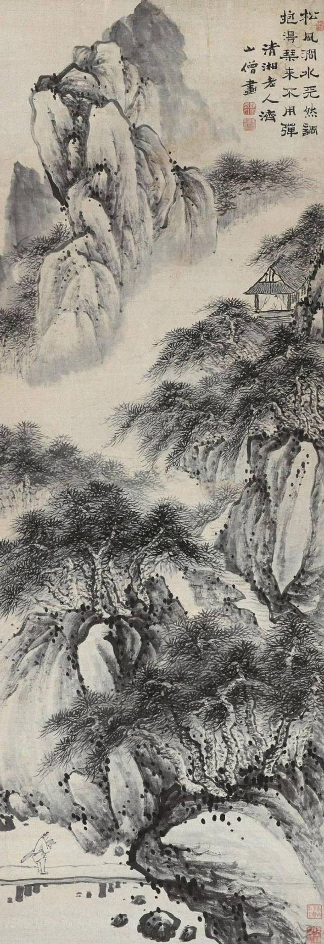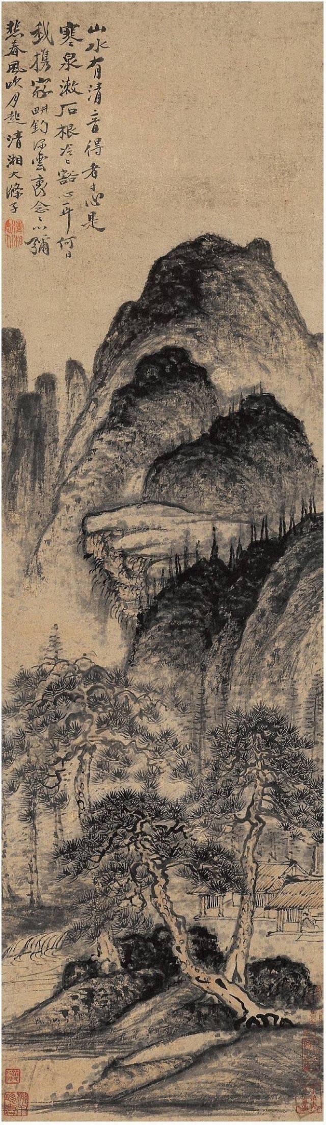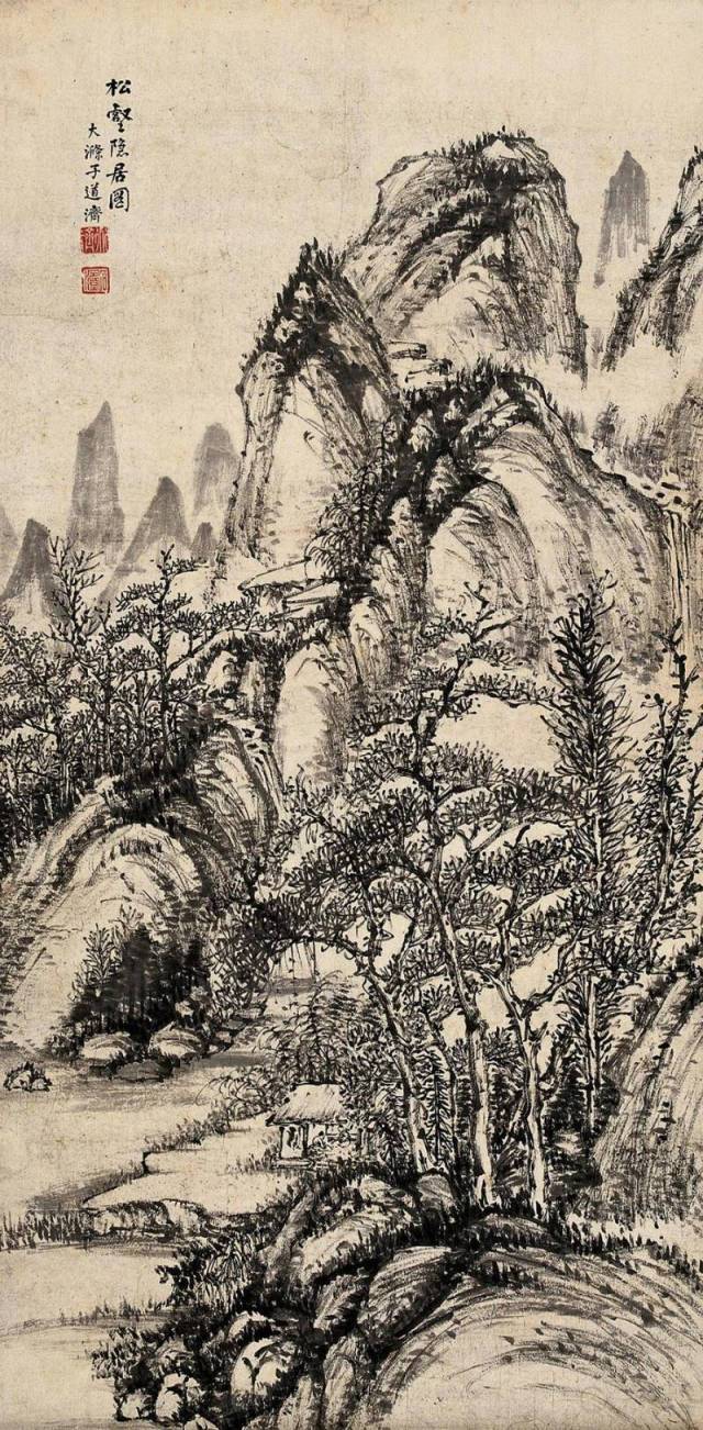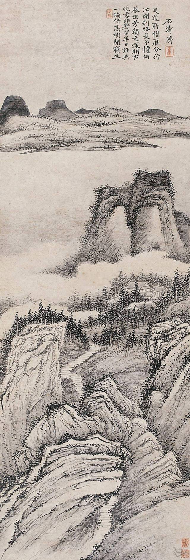 石涛(1630一1724)清初四僧之一。法名原济,一作元济、道济。半世云游,饱览名山大川,是以所画山水,笔法恣肆,离奇苍古而又能细秀妥帖,为清初山水画大家,石涛作画构图新奇,无论是黄山云烟,江南水墨,还是悬崖峭壁,枯树寒鸦,或平远、深远、高远之景,都力求布局新奇,意境翻新。