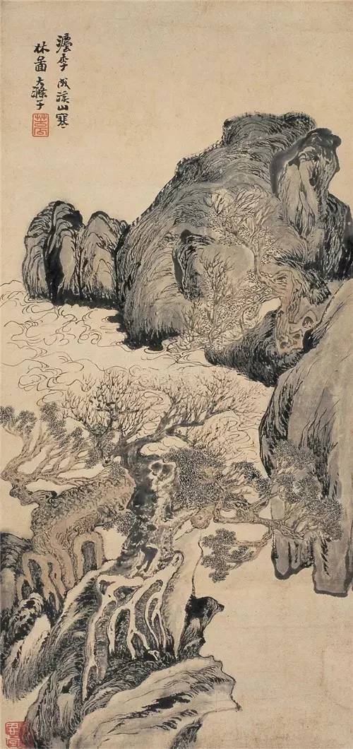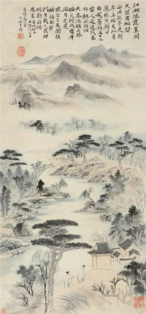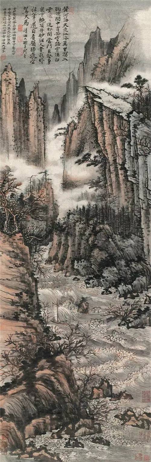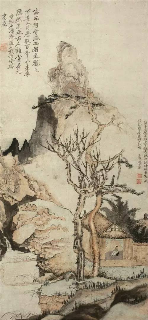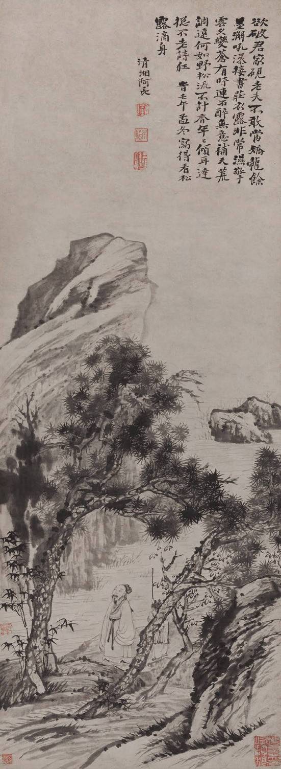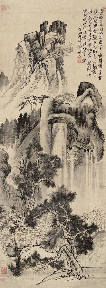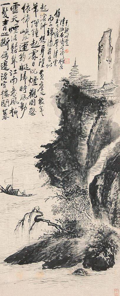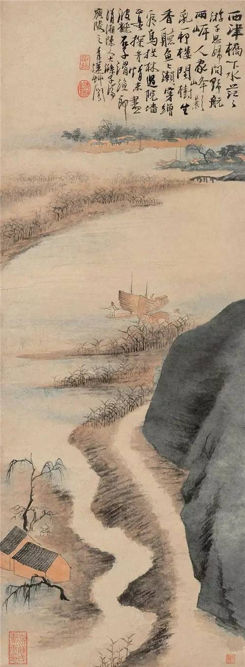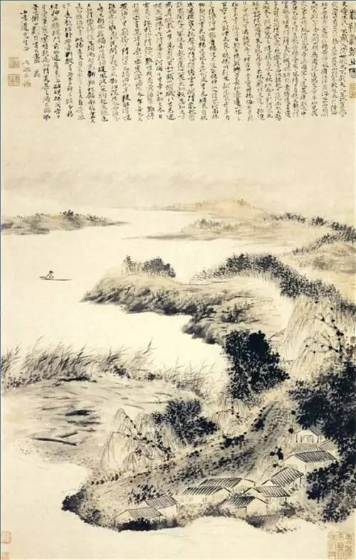 石涛(1630一1724)清初四僧之一。法名原济,一作元济、道济。半世云游,饱览名山大川,是以所画山水,笔法恣肆,离奇苍古而又能细秀妥帖,为清初山水画大家,石涛作画构图新奇,无论是黄山云烟,江南水墨,还是悬崖峭壁,枯树寒鸦,或平远、深远、高远之景,都力求布局新奇,意境翻新。