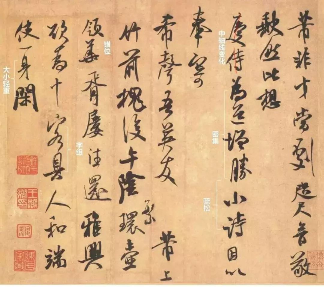 从章法的技术含量来说,用的招数比较全面:如字组、中轴线倾斜的变化、错位、大小轻重、疏密等,确实让我们佩服,字数不多,招数尽显。