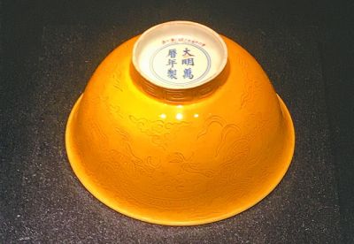 浇黄釉锥拱云龙纹碗(陶瓷)