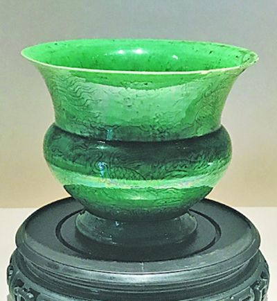 如果说繁密精致的青花图案让人眼花缭乱,那么当你看到《瓜皮绿釉碗》的苍翠绿色,《浇黄釉锥拱云龙纹碗》的耀眼橙黄,或是《矾红釉描金双系尊》的厚重深红,也许会由衷赞叹单色釉所具有的动人心魄的视觉感染力。嘉靖时期景德镇御器厂烧造的单色釉瓷器,按烧成温度大致可分为低温单色釉和高温单色釉两大类。低温单色釉瓷的烧成温度一般低于1250℃,其中以浇黄釉瓷产量最大,属于最高等级的宫廷用瓷。浇绿釉因呈色似西瓜皮之绿色,故俗称“瓜皮绿釉”,是以氧化铜为主要着色剂、氧化铅为主要助熔剂的低温绿釉。