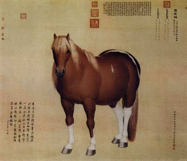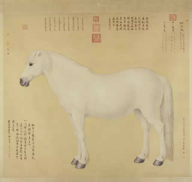 郎世宁的画马作品有很多,一部分是奉皇帝之命,对照着真马所画的写生画;另一部分根据自己的观察、体会而创作的画幅。他画马尤为注重马匹的解剖结构,采用短细的小线来造型,讲究马匹皮毛质感的表达,强调马匹的立体感和厚重感,颇有杜甫诗咏画马的境界:“须臾九重真龙出,一洗万古凡马空。”
