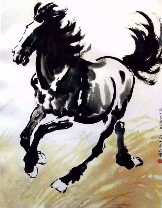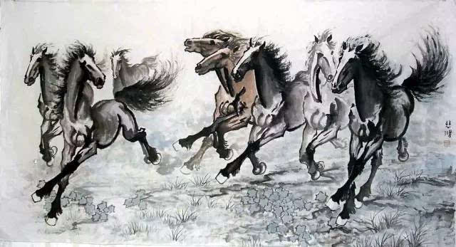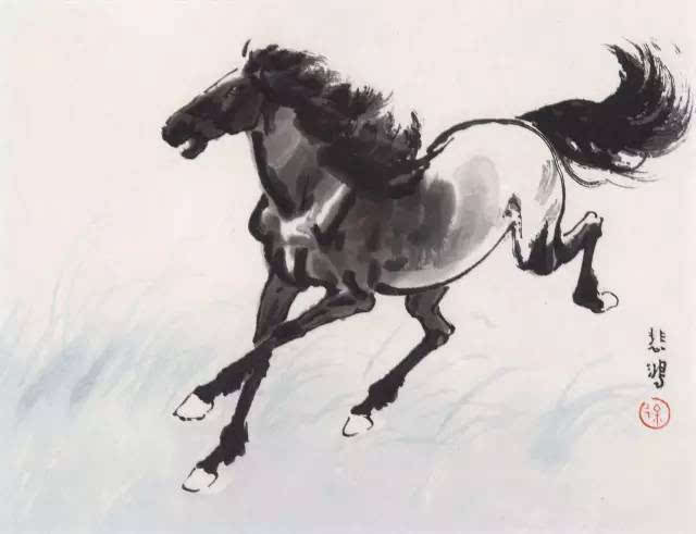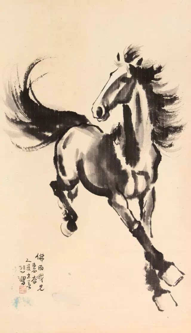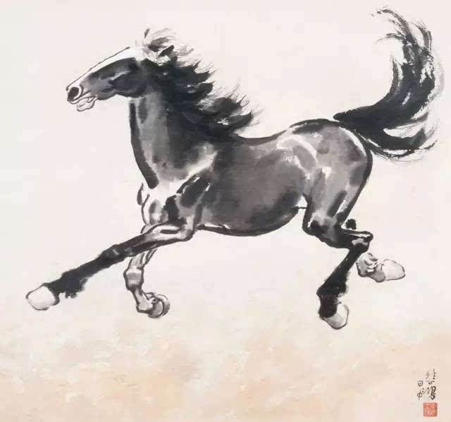 徐悲鸿是画马驰名的大家,他的骏马画,英俊豪放,独创一格,既有传统画马的功底,又吸收了西画的长处,为近现代画马的发展开辟新蹊径。在他笔下,一匹匹奔马奋踪扬蹄,在广袤的土地上飞奔,英姿飒爽,神态各异。有的腾空起飞,有的蹄下生烟,有的回首顾盼,有的一往直前,仿佛都要破纸而出。都说画马难画骨,徐先生不仅画出了马骨,更画出了马的神。