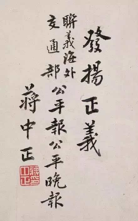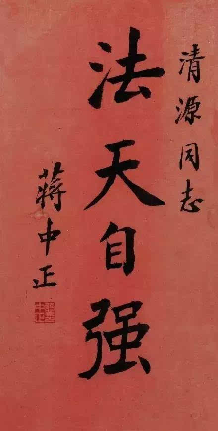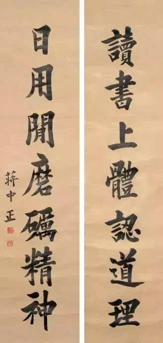 蒋介石书法不乏功底,以楷书为主,很少写行书。他的楷书以柳公权、欧阳询为根基,晚年又多有赵孟頫的影子,顿挫分明,结体有度,骨力雄强,章法严谨,从中不难看出他的刚健向上的精神和不屈不挠的倔强性格。他的楷书用笔以方笔为主,横斜竖直,撇低捺高,表现出瘦硬挺骨之风范。