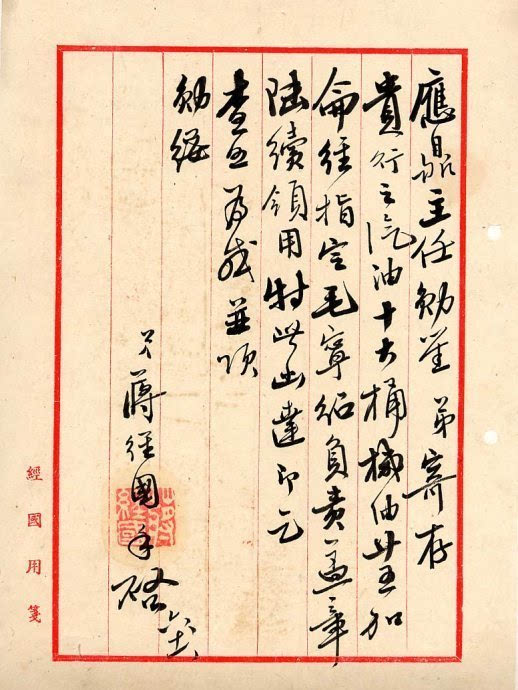 此作是蒋经国调拨汽油的手谕,笔力秀雅,颇有文人之风。