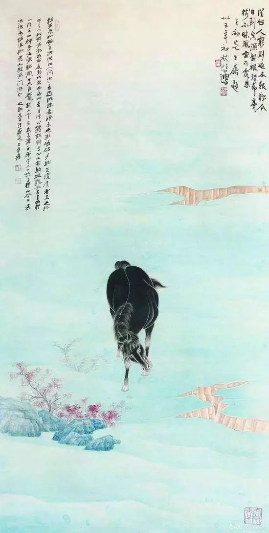 画作中马蹄硕大,当是取法敦煌北魏壁画,张大千评价:“北魏画马……马蹄较常马大两倍,其夸张与此概见。”此作正值画家复笔重彩风格逐渐成熟的时期,色彩妍丽高雅。既可见大千先生一路上溯血战古人,又可见其笔墨技巧至臻至精,极珍罕。