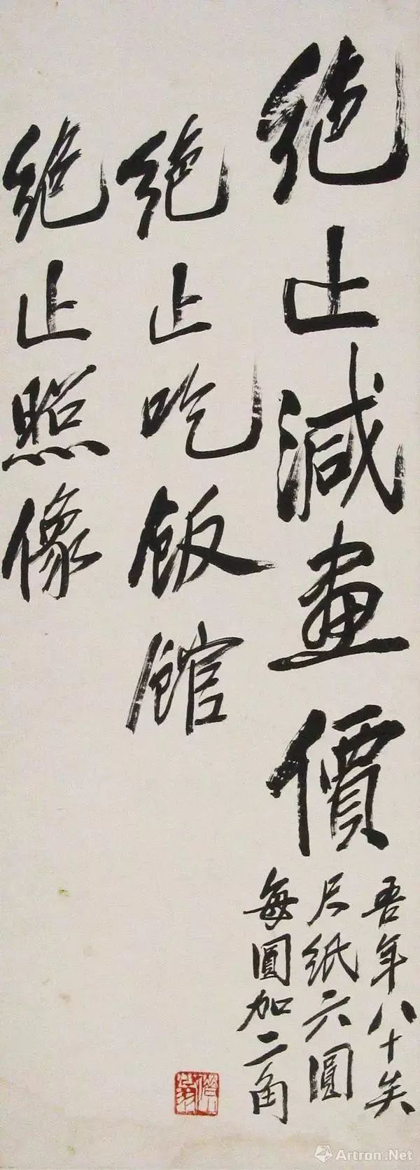 绝止减画价 ,绝止吃饭馆,绝止照像。后面加一句小字:“吾年八十矣,尺纸六圆,每圆加二角。”
