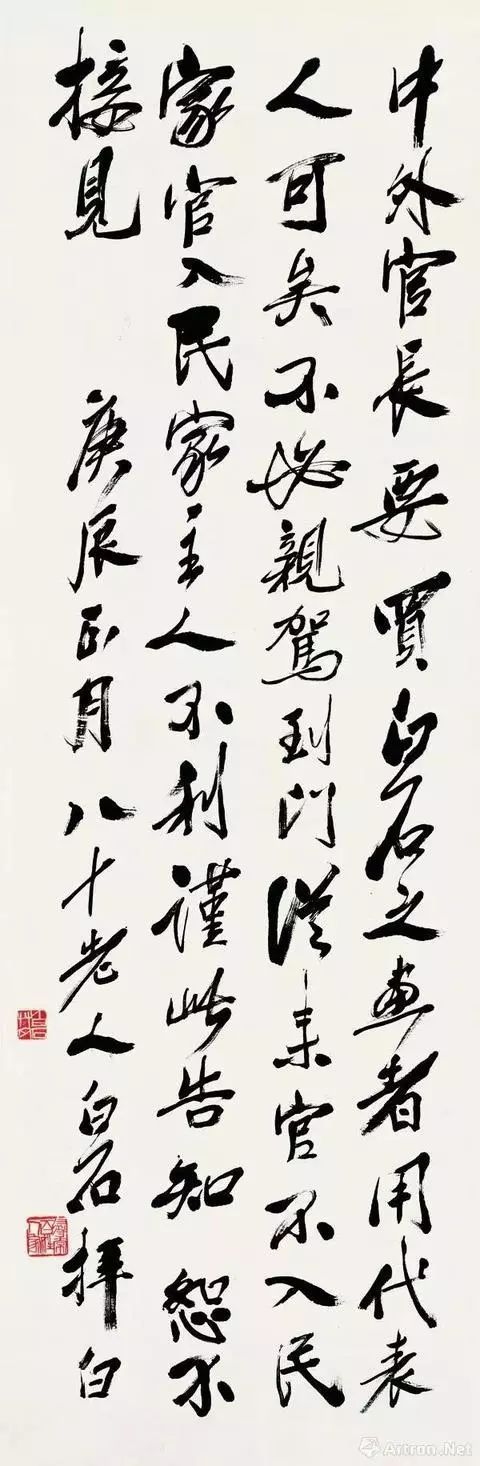 君子爱财,取之有道,白石老人并非所有财都好,也并不与日寇同流合污:“中外官长,要买白石之画者,用代表人可矣,不必亲驾到门。从来官不入民家,官入民家,主人不利。谨此告知,恕不接见。”