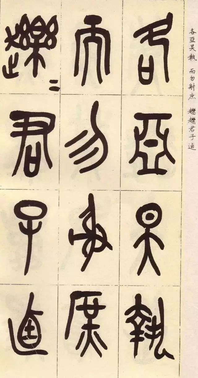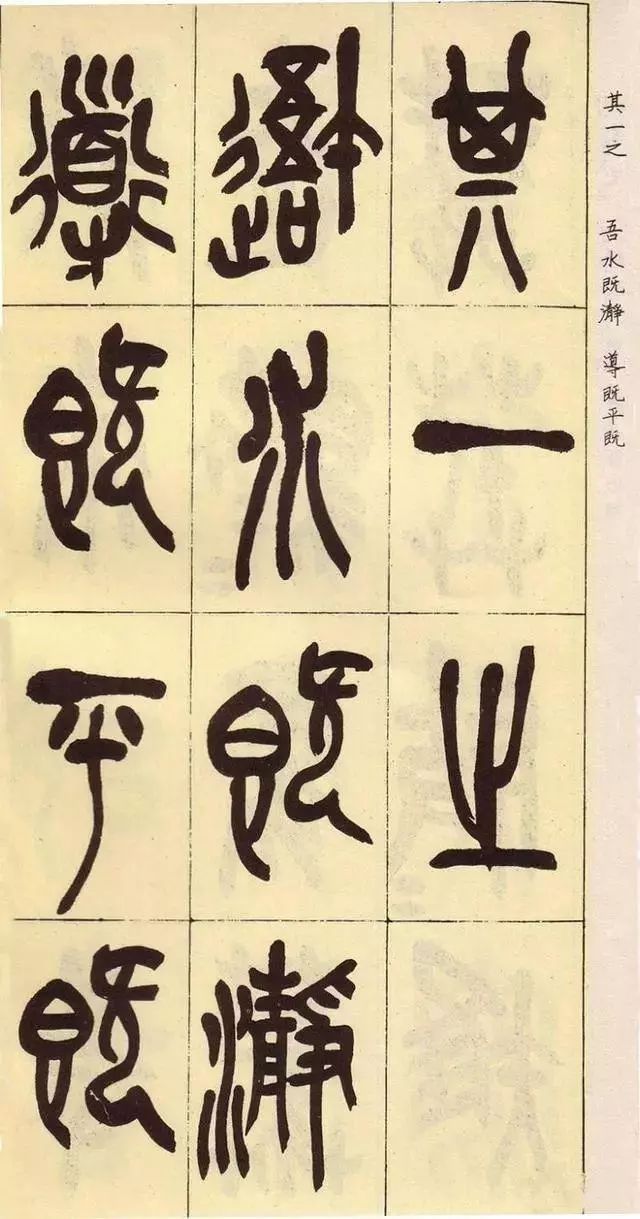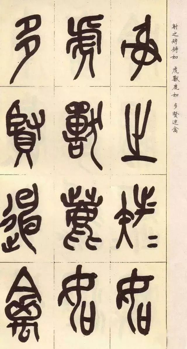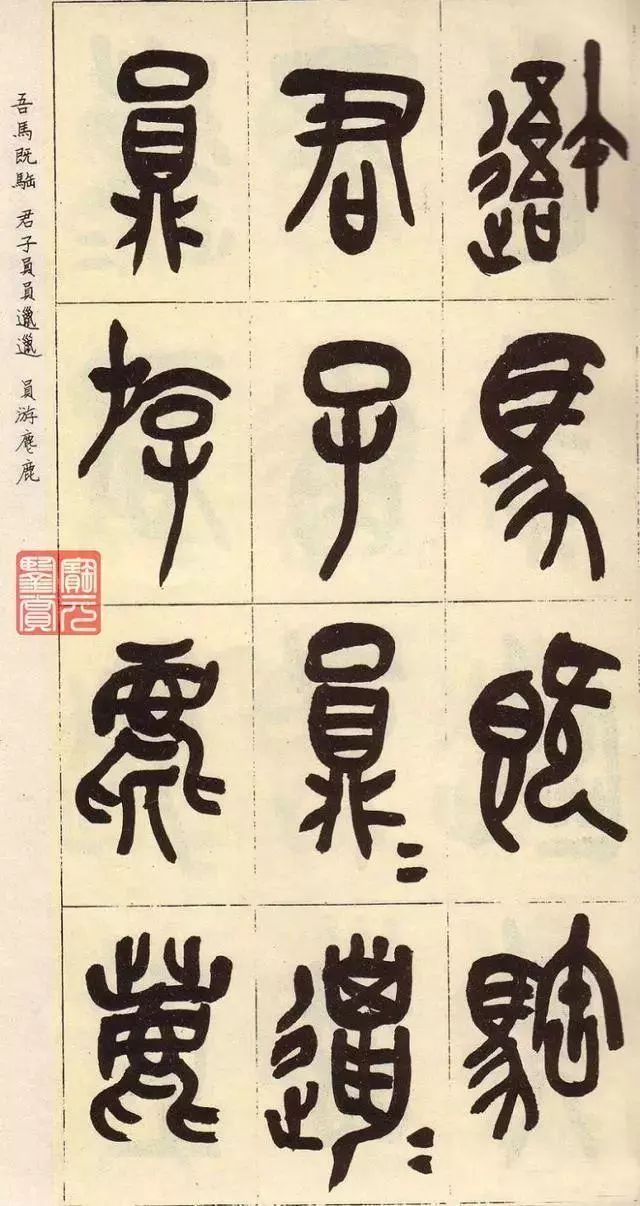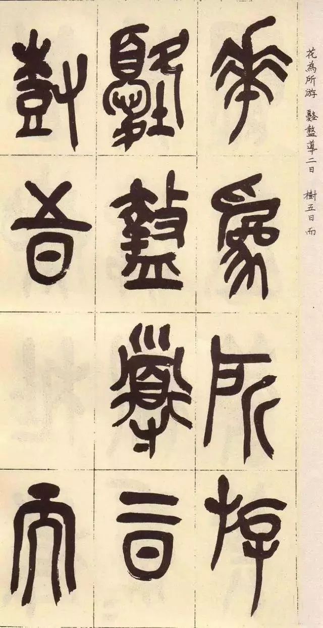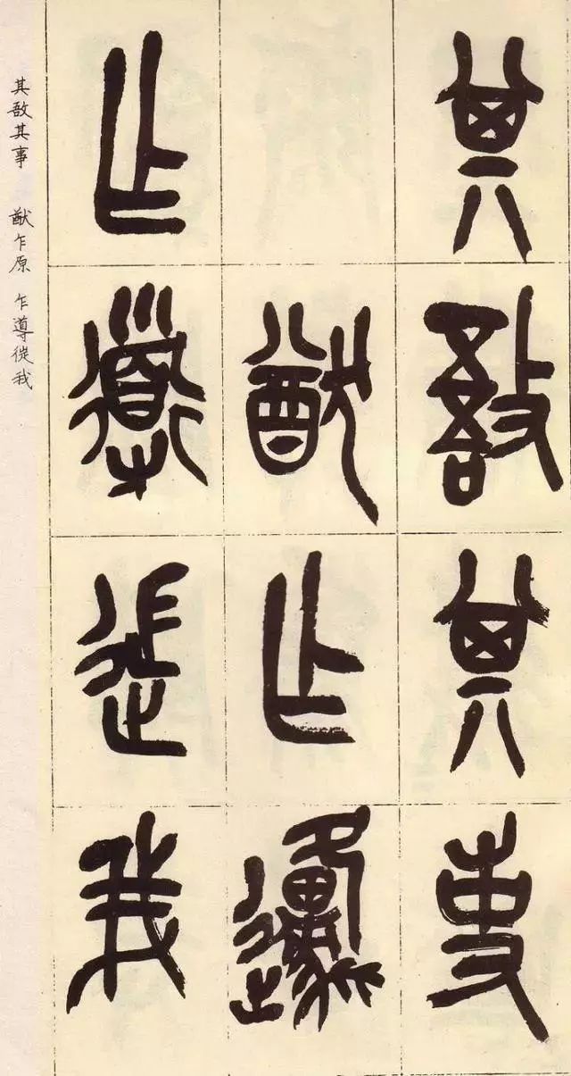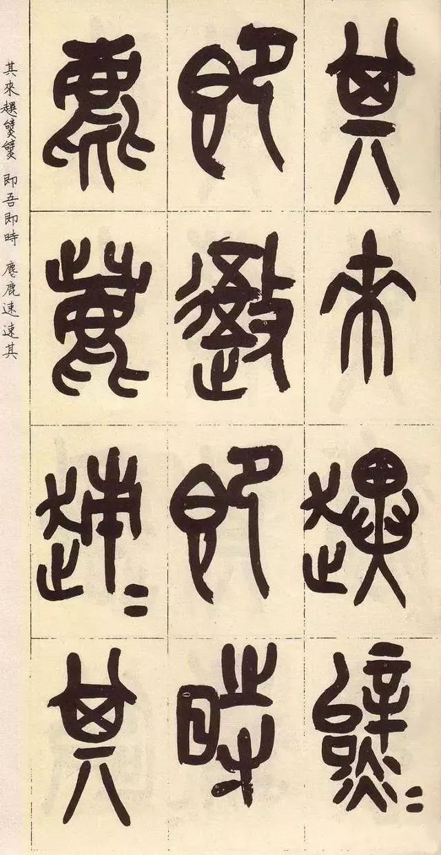 在中国美术馆,藏有一册吴昌硕书画合璧。书为其临写的石鼓文,昼为菊花、桂花、荷花等写意花卉。诚如方家所评,其临写的石鼓文用笔遒劲,气息深厚,结体以左右上下参差取势,可谓自出新意,前无古人。此册为十二开,纵三十三厘米,横三十七厘米,书家摹写的石鼓文字数较多,是一件极为难得的墨宝。