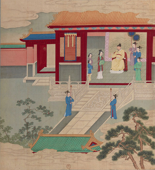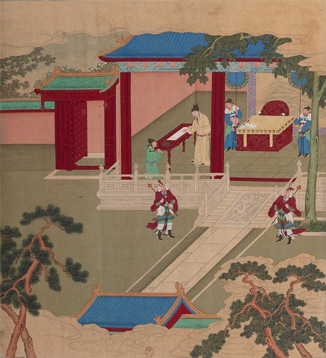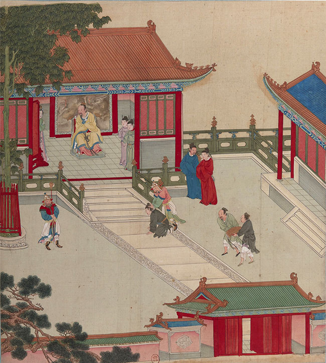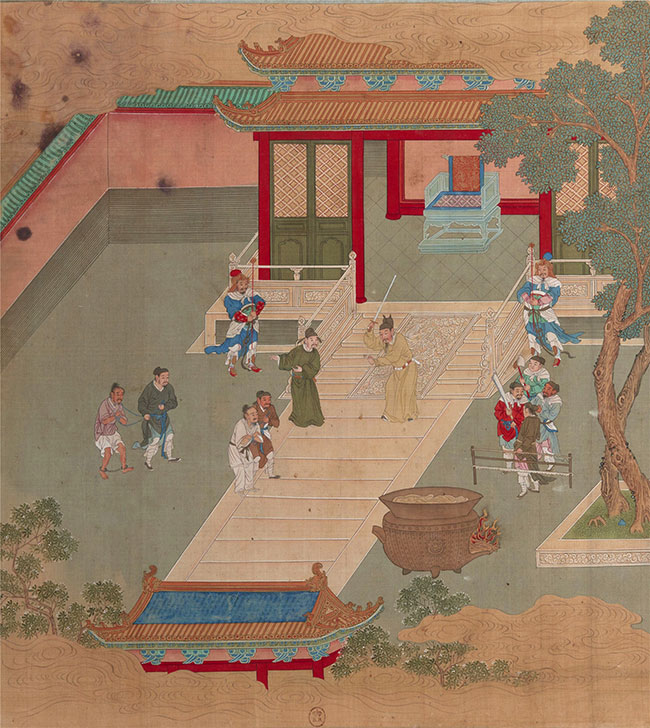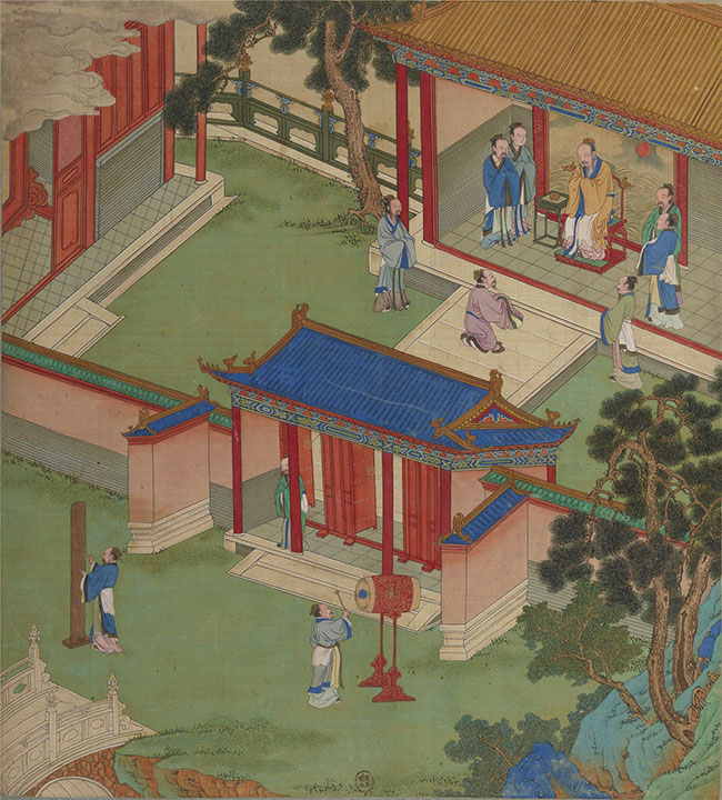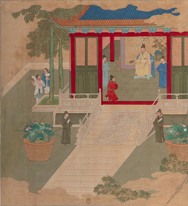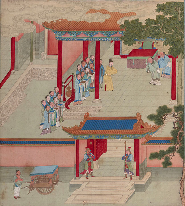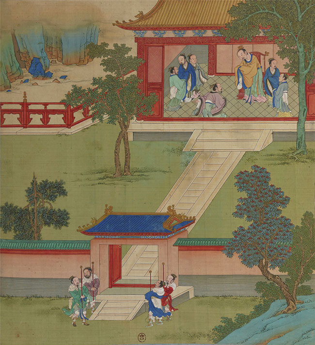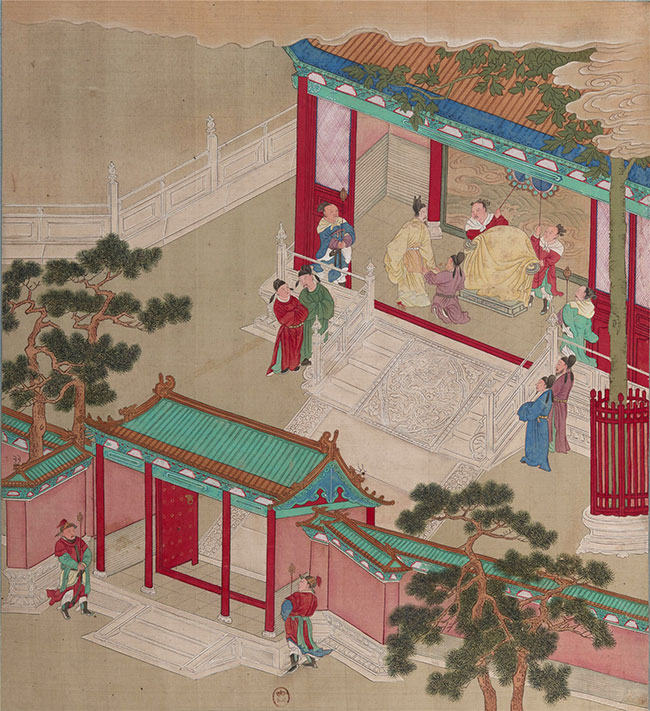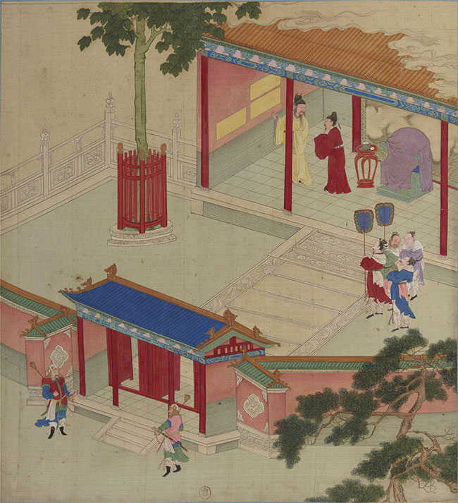 在《帝鉴图说》中,图画部分占有相当的份量,书中每一则事例都配着一幅画,每幅画都占一整幅页码。有明一朝,绘画艺术得到了长足的发展,除了沈周、祝允明、唐寅、文征明之外,还出现了仇英、陈洪绶等著名人物画家。《帝鉴图说》的绘画者虽未署名,但以其为御用图书配画的资格论,想必为一时之选。画面上,以二维空间表现透视关系,线条流畅,造型生动,人物的表情、动态、服饰无不精心绘制,充分展示了当时绘画艺术的超卓技艺。