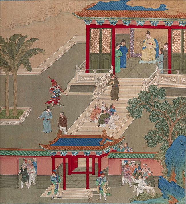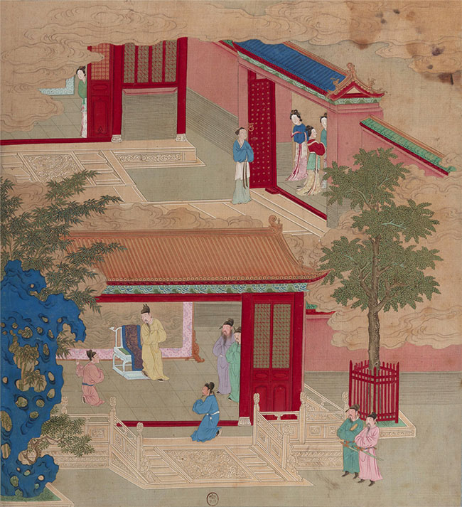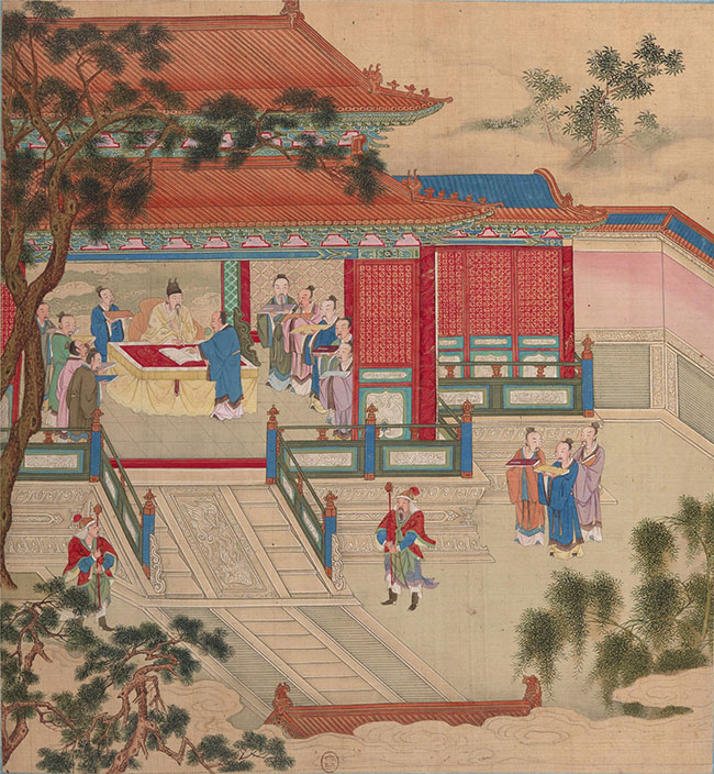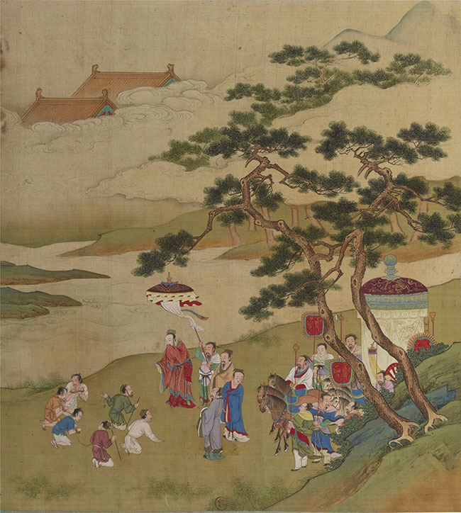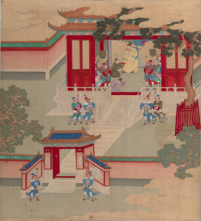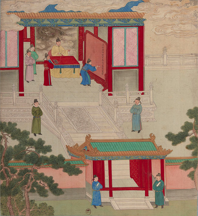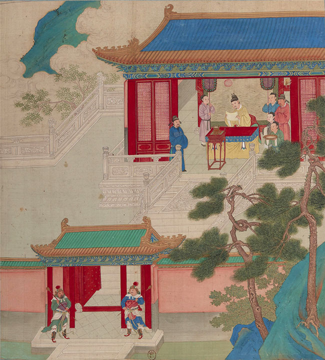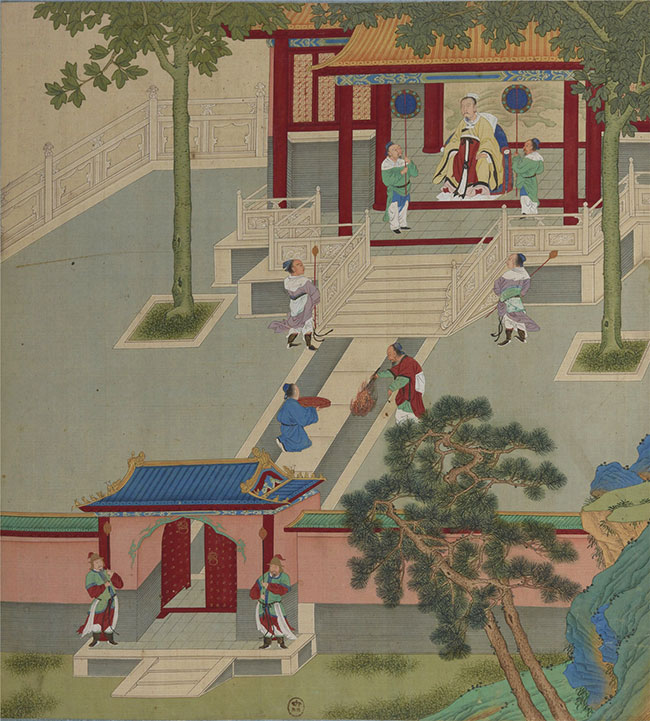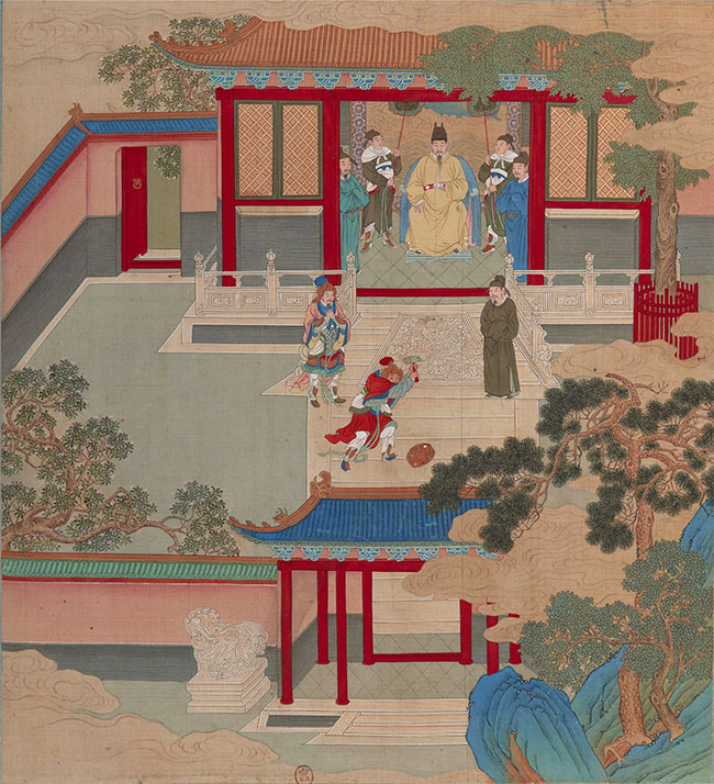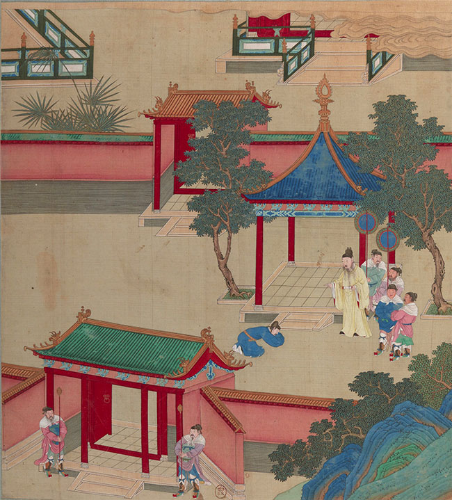 在《帝鉴图说》中,图画部分占有相当的份量,书中每一则事例都配着一幅画,每幅画都占一整幅页码。有明一朝,绘画艺术得到了长足的发展,除了沈周、祝允明、唐寅、文征明之外,还出现了仇英、陈洪绶等著名人物画家。《帝鉴图说》的绘画者虽未署名,但以其为御用图书配画的资格论,想必为一时之选。画面上,以二维空间表现透视关系,线条流畅,造型生动,人物的表情、动态、服饰无不精心绘制,充分展示了当时绘画艺术的超卓技艺。