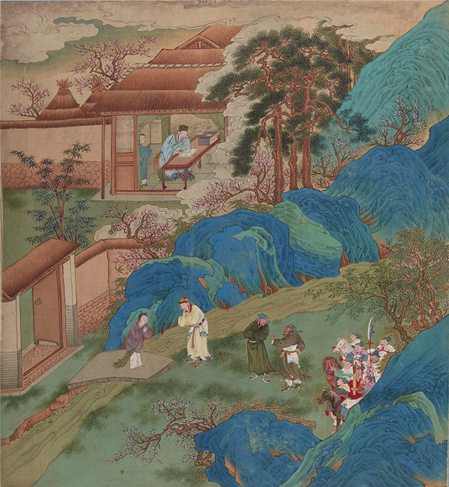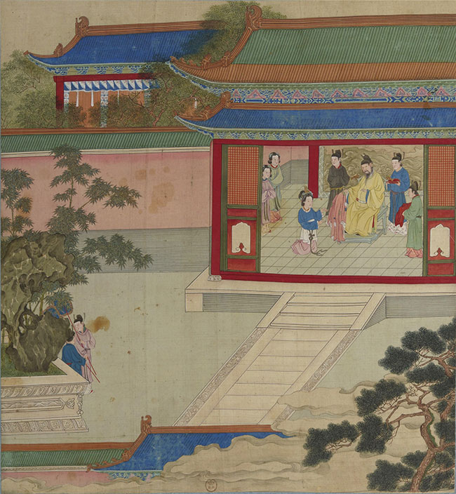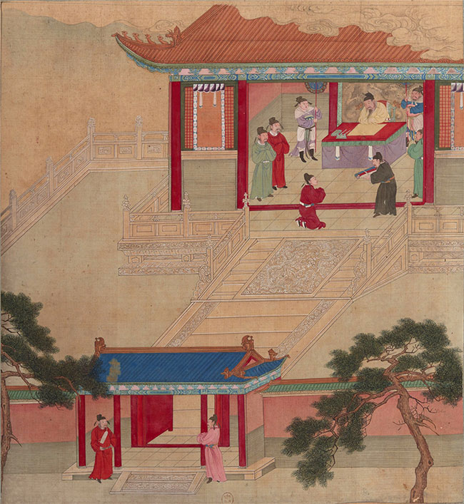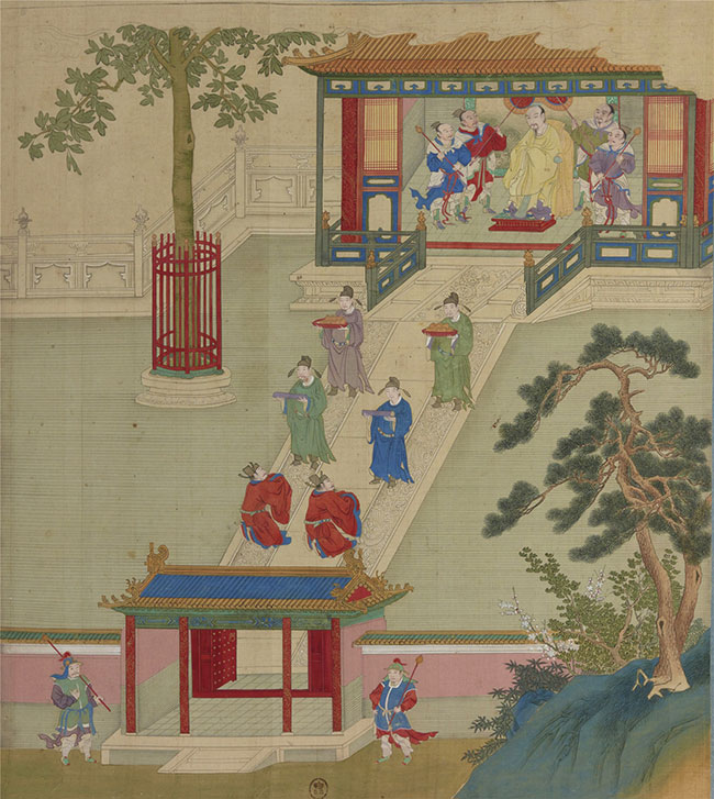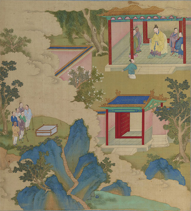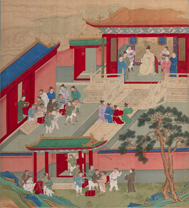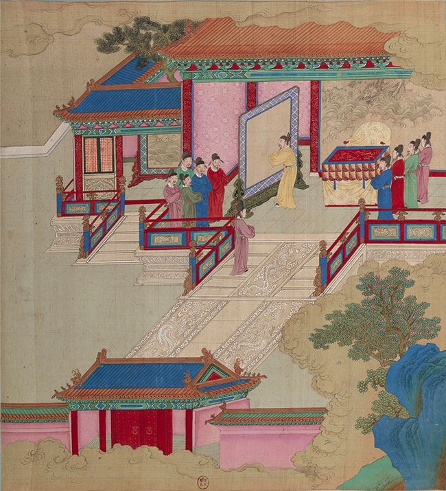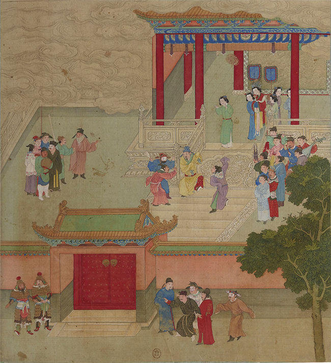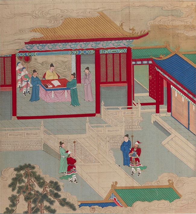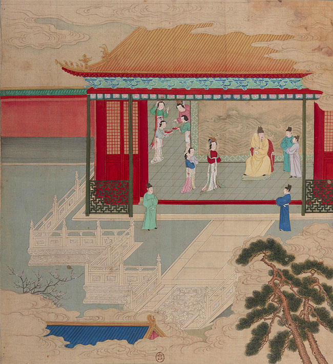 在《帝鉴图说》中,图画部分占有相当的份量,书中每一则事例都配着一幅画,每幅画都占一整幅页码。有明一朝,绘画艺术得到了长足的发展,除了沈周、祝允明、唐寅、文征明之外,还出现了仇英、陈洪绶等著名人物画家。《帝鉴图说》的绘画者虽未署名,但以其为御用图书配画的资格论,想必为一时之选。画面上,以二维空间表现透视关系,线条流畅,造型生动,人物的表情、动态、服饰无不精心绘制,充分展示了当时绘画艺术的超卓技艺。