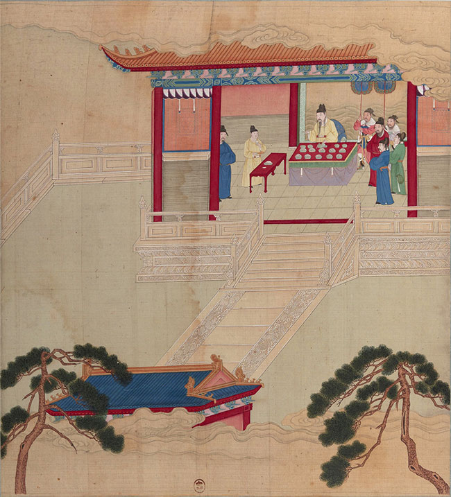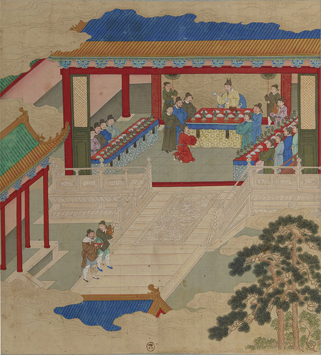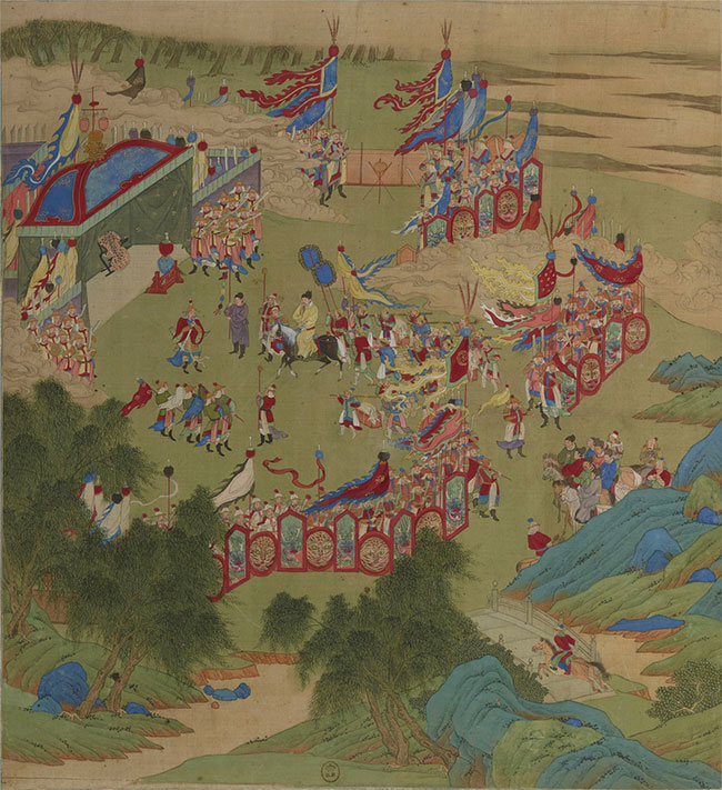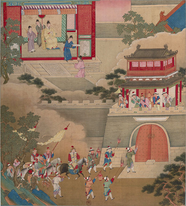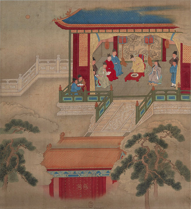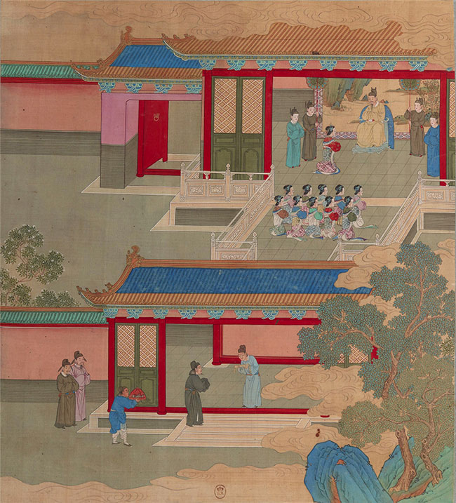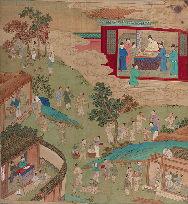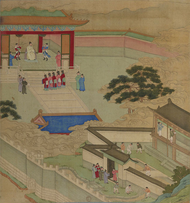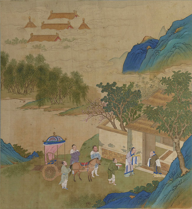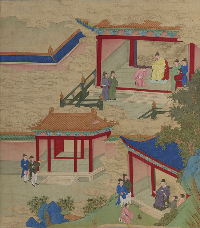 在《帝鉴图说》中,图画部分占有相当的份量,书中每一则事例都配着一幅画,每幅画都占一整幅页码。有明一朝,绘画艺术得到了长足的发展,除了沈周、祝允明、唐寅、文征明之外,还出现了仇英、陈洪绶等著名人物画家。《帝鉴图说》的绘画者虽未署名,但以其为御用图书配画的资格论,想必为一时之选。画面上,以二维空间表现透视关系,线条流畅,造型生动,人物的表情、动态、服饰无不精心绘制,充分展示了当时绘画艺术的超卓技艺。