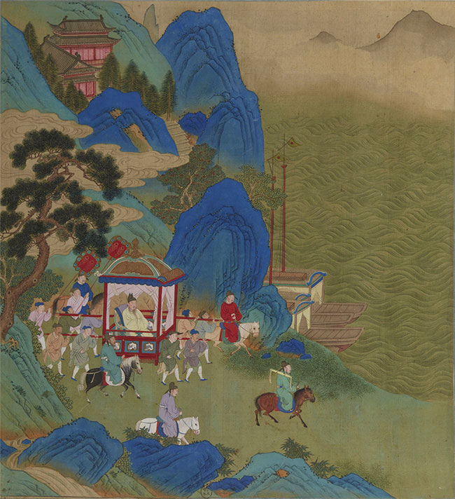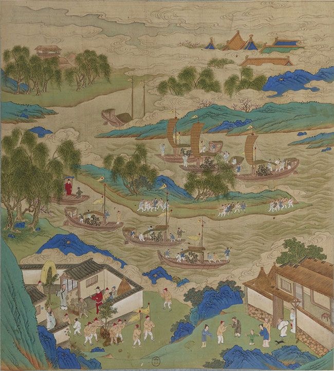 隋史上记:炀帝从水路巡幸扬州江都地方,所乘的龙舟极其高大。一舟四层:上层有正殿、内殿、朝堂,中两层有一百二十间房,这三层都用金玉装饰。第四层是内侍所居。皇后乘的叫做翔螭舟,制度略小些,也一样华丽。别有九只船叫做浮景,一船三层。这九只船都是水殿,以像离宫另馆。其余船数千只,是后宫、诸王、公主、百官以下乘的。共用扯船的夫八万余人,皆以锦彩为衣。还有护卫军士坐的船,又数千只。这许多船在江中,头尾相接,二百余里远。又有马军摆列着在两岸上,夹舟而行。所过州县,五百里内,都要供献饮食。多者,就有百车;穷极水陆珍奇品味。后宫厌饫,用不尽的,无处安顿,多弃埋之。