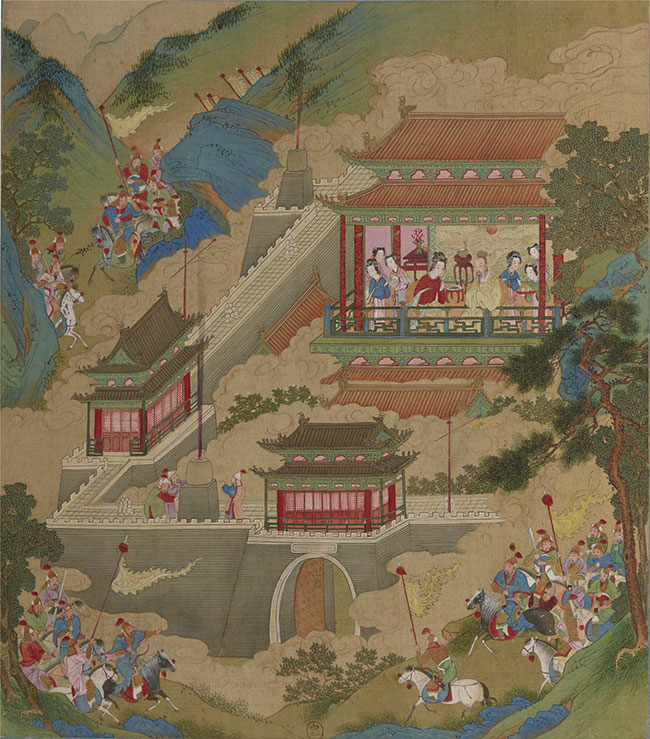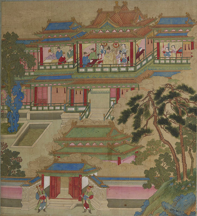 六朝陈史上记陈后主叔宝在位,荒淫无度。起三座高阎,一名临春,一名结绮,一名望仙。各高数十丈,闽数十闯,其窗牖栏杆,都是沉檀好木做成的。又饰以金玉,嵌上珠翠,阁里所摆设的衣服、玩器,都是珍奇美丽之物,近代所未曾见者,其宫室服用奢侈如此。后主又好为词曲,选宫人能文的,叫做女学士。群臣能文的,如江总、孔范等,都纵容他出入禁中;陪侍游宴,叫做狎客。后主每饮宴,即命诸妃嫔及女学士与狎客每同作诗,一赠一答,以为娱乐,无复顾忌。诸诗之中,拣词语极艳丽的,被诸管弦新作一样腔调。选宫女千余人都唱此曲,与乐声相和,其曲有《玉树后庭花》及《临春乐》等名目。曲中的说话,大略都是夸美诸妃嫔的容色而已。君臣酣饮狂歌,自晚上到天明。每日是如此,以为常事。其声色游宴之娱又如此。