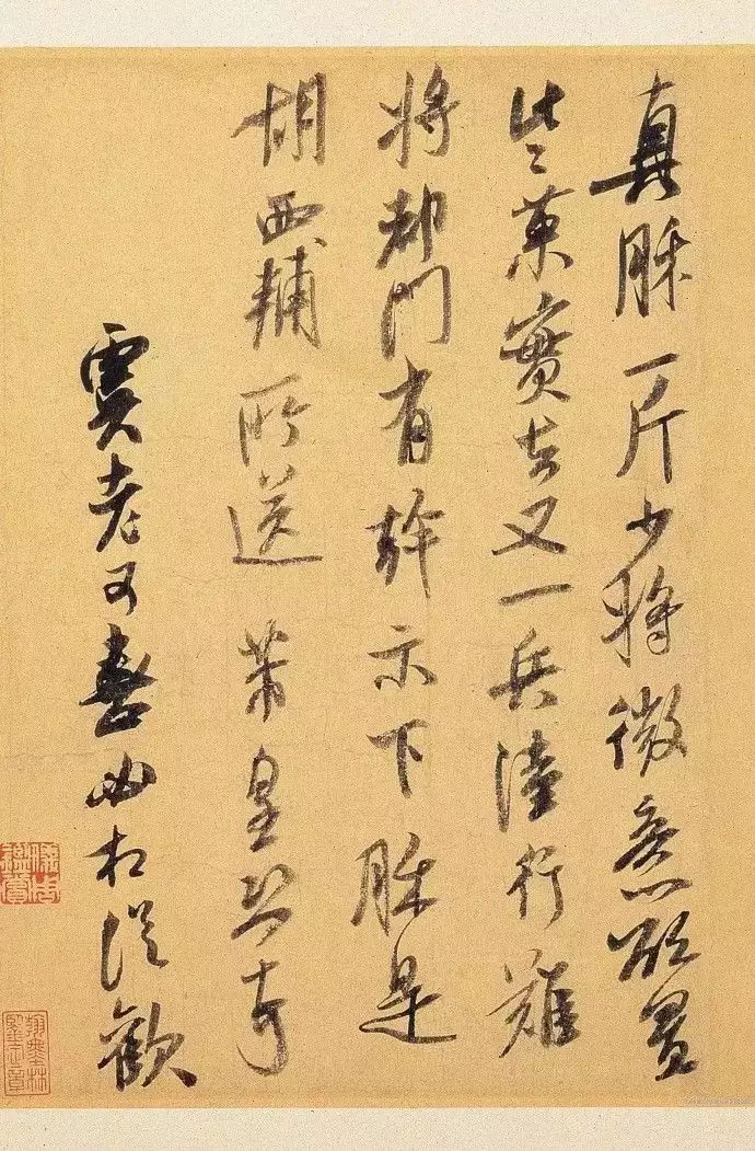▲米芾《向乱帖》,又称《寒光帖》 淡黄纸本。行草书。纵27.3厘米 横30.3厘米 北京故宫博物院藏。
