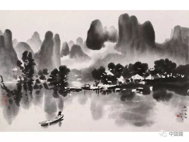 在桂林阳朔,画家敏锐地捕捉住自然变化的脉搏,以无比酣畅的泼墨挥写春雨迷蒙中的漓江秀色。浓淡变幻的深浅墨块意到笔随地让雨中出现了隐隐约约的村镇、房屋,山光与云影仿佛在随水荡漾。如果说法国印象派是以色块取代了线条,那么,《漓江春雨》则异曲而同工,用墨块去融化了线条。它与《喜马拉雅山》、《月光如洗》等名作一起,首次让中国山水画自然地进入对光影的表现,开辟了这一古老画种的崭新一页。