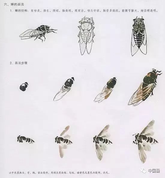 中国国画技法—蝉的画法步骤:以干墨画头、胸、背,留出亮部,用稍淡墨添翅、勾纹,赭黄色或墨色画腹部,添足。(见上图)