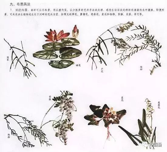 国画虾可以不布景,用以虚代实、以少胜多的艺术手法来处理,感觉生动活泼的虾群在清澈的水中漫游。即便布景,可采用水生植物或长于河畔的花木为宜,如萍花、菖蒲花、慈菇花、菱花和杨柳、紫藤、芙蓉、翠竹等。 (见图四)