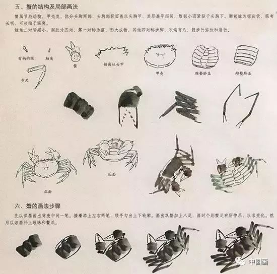中国国画技法—螃蟹的画法步骤:先以深墨画出背壳中间一笔。接着添上左右两笔,水手勾出上下轮廓。画出双螯加上八足,画时个别蟹足有所伸屈,以求变化。然后以浓墨补上眼珠和蟹爪。(见图一)