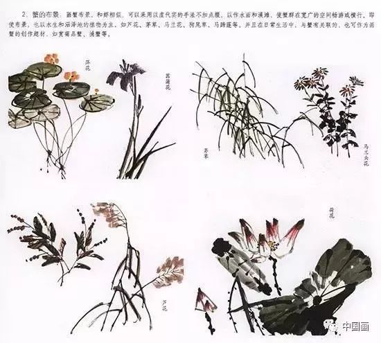 中国国画技法—螃蟹的布景:画蟹布景和画虾相似,可以采用以虚代实的手法不加点缀,以作水面和溪滩,使蟹群在宽广的空间畅游或横行。即使布景,也以水生和沼泽地的植物为主,如芦花、茅草、马兰花、狗尾草、马蹄莲等。并且在日常生活中,与蟹相关链的也可以作为画蟹的创作题材,如赏菊品蟹、捕蟹等。