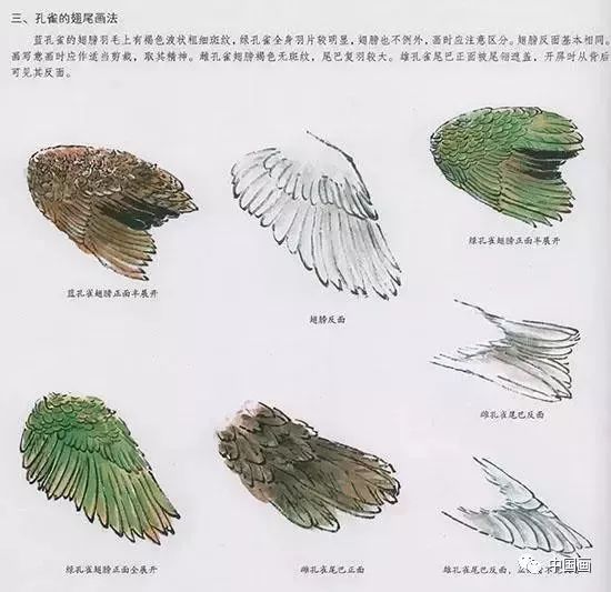 蓝孔雀的翅膀羽毛上有褐色波状粗细斑纹,绿孔雀全身羽片较明显,翅膀也不例外,画时应注意区分。翅膀反面基本相同。画写意时应做适当剪裁,取其精神。(如:图4)