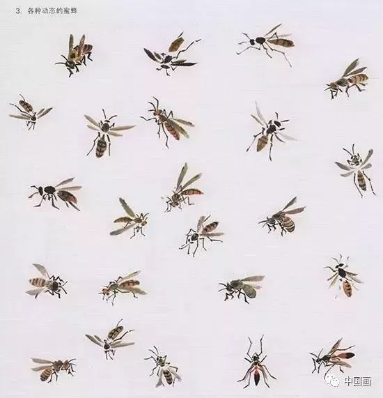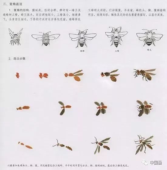 中国国画技法—蜜蜂的结构:膜翅类,性好合群,群中有一蜂王及雄蜂和工蜂,蜂王体大,前后两翅短小。工蜂体小,翅健善飞,全身密生细毛,下唇的中央有长舌善吮花蜜。雄蜂体比工蜂稍大而短,行动缓慢,不采蜜。蜂的头、胸、腹部结构明显,翅薄而轻。触角及足的动态要着意描写,以显示其美。