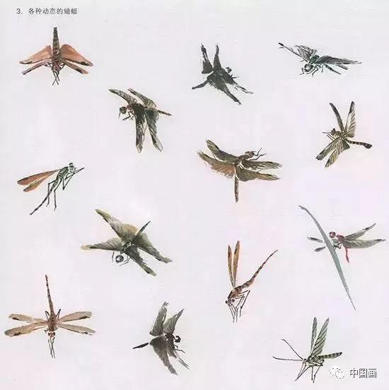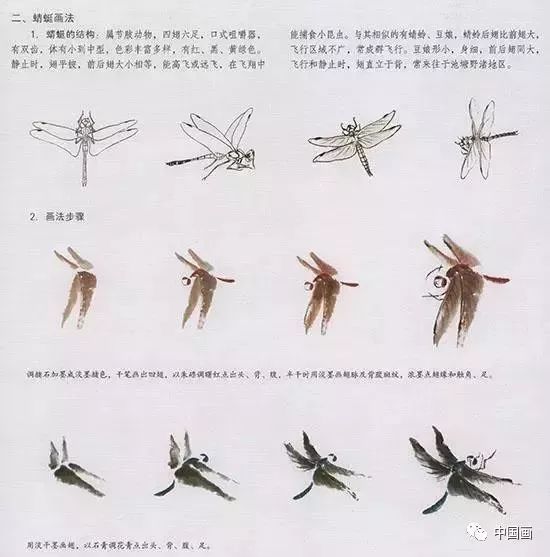 中国国画技法—蜻蜓的画法步骤:调赭石加墨成淡墨赭色,干笔画出四翅,以朱磦调曙红点出头、背、腹,半干时用淡墨画翅脉及背腹斑纹,浓墨点翅缘和触角、足;或以淡干墨画翅,以石青调花青点出头、背、腹、足。(见上图)