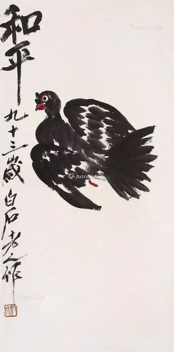 世界和平委员会请齐老画和平鸽,齐白石平时很少见到鸽子。为了画好,专门让家丽人养一群鸽子,有事没事观察它们的起落。