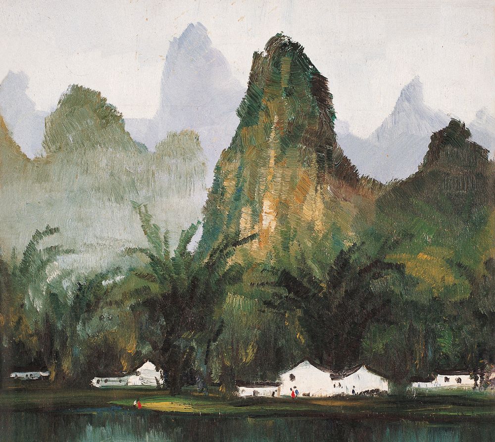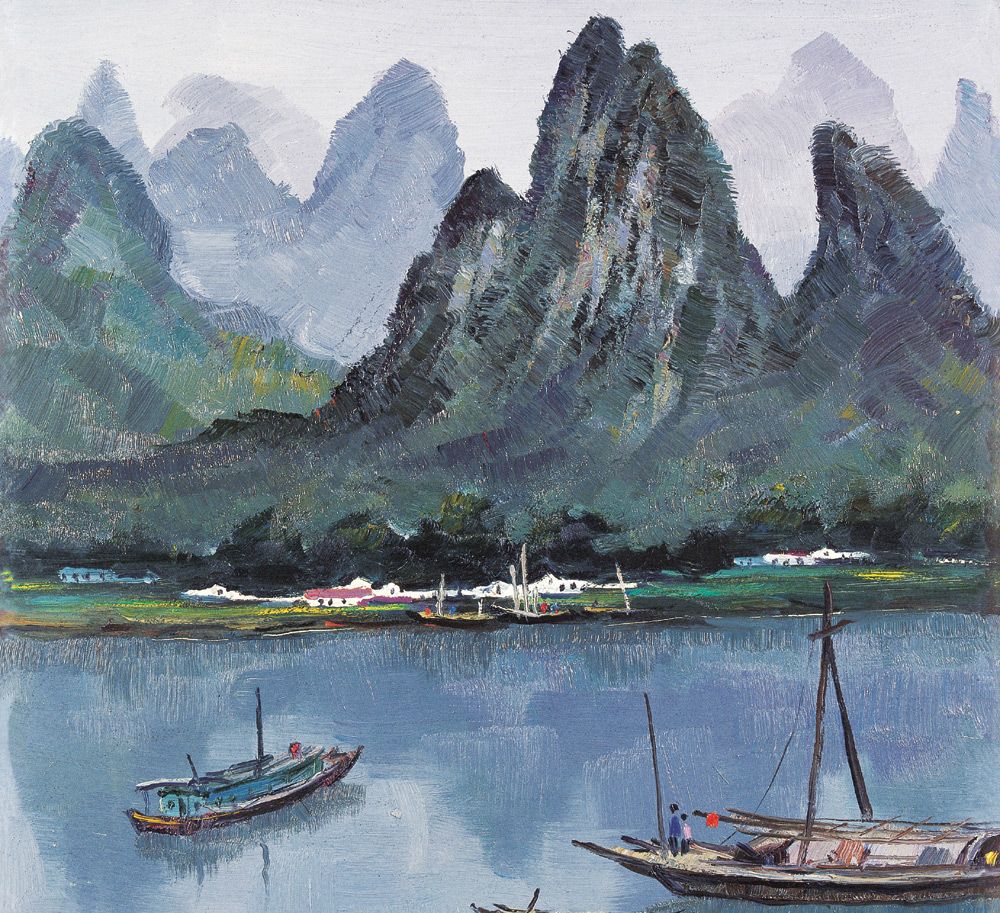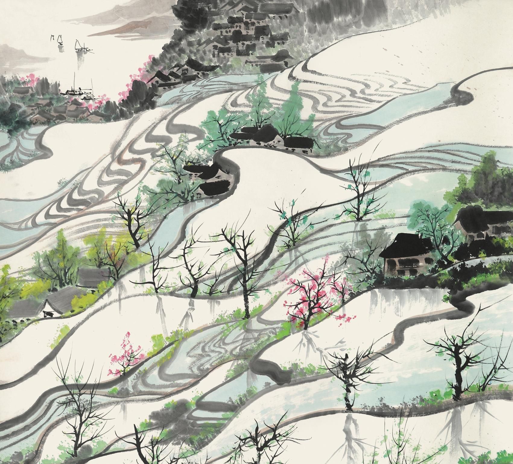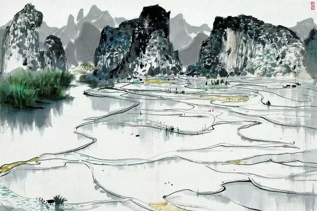 这是画的桂林山水,那梯田在大师笔下呈现出极美的韵律感。