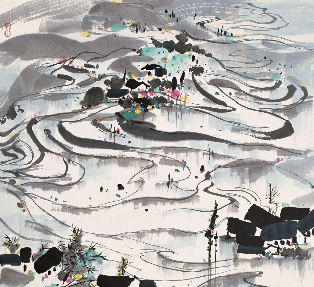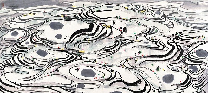 而曲线绕着圈圈,墨水舞着点点,却巧妙地把梯田的形状给勾画了出来。这些大自然的美丽风光,凸显着吴冠中先生那满腔的山河情。