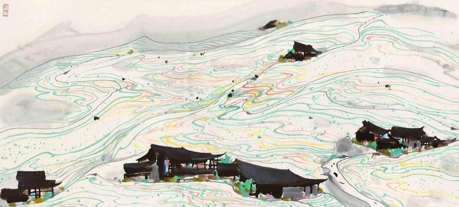 这幅图中的房屋,是吴冠中先生独有的画风。说实话,以前我没有深入了解吴冠中先生的画作,这一次仔仔细细看了个遍,这大师啊,没这两刷子还真不好当,吴冠中先生的功力那叫一个技压群芳,叹服!亲爱的读者朋友,你们喜欢这些梯田画吗,可以学学吴冠中老师的画风,简约而不简单哦。