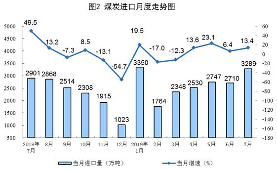 7月份,进口煤炭3289万吨,同比增长13.4%,比上月增加579万吨;1—7月份进口煤炭18736万吨,同比增长7.0%。