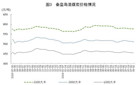 煤炭价格小幅回落。8月2日,秦皇岛5500大卡煤炭综合交易价格为每吨577元,5000大卡为每吨511元,4500大卡为每吨454元,比6月28日分别回落3元、2元和3元。