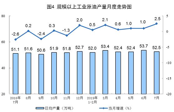 7月份,生产原油1629万吨,同比增长2.5%,增速比上月加快1.5个百分点;日均产量52.5万吨,比上月减少1.2万吨。 1—7月份,生产原油11131万吨,同比增长1.0%。