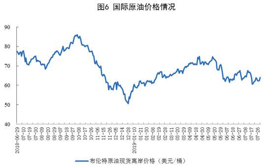 国际原油价格震荡下行。7月31日布伦特原油现货离岸价格为64.1美元/桶,比6月28日下跌3.5美元。
