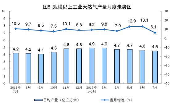 7月份,规模以上工业原煤、原油生产加快,天然气、电力生产放缓。