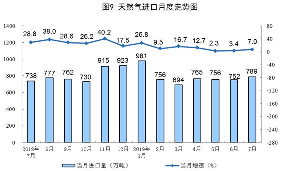 7月份,进口天然气789万吨,同比增长7.0%,比上月增加37万吨;1—7月份,进口天然气5474万吨,同比增长10.8%。