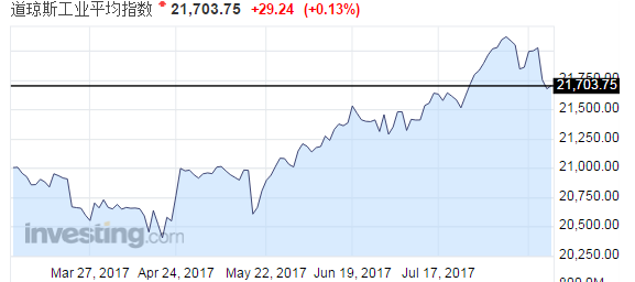 【美股】美股标普500指数小幅收高,之前连跌两日,但美国和朝鲜之间的局势愈发紧张,令投资人保持不安,且油价下挫打压能源股。道指收高0.13%,标普500指数微升0.12%,纳斯达克指数微跌0.05%。