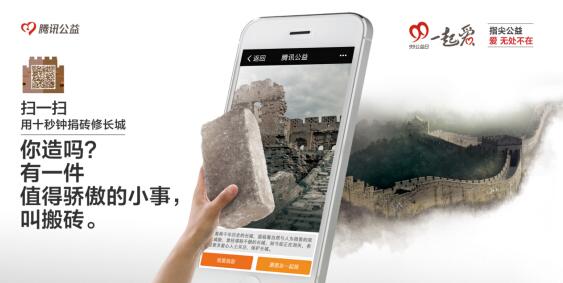 其中,作为2017年“99公益日”预热,腾讯携手长城保护等7大公益项目入驻深圳、北京、杭州、西安机场的364个线下展位,开展公益爱心show。旅客可通过扫描二维码进入“保护长城加我一个”页面,表达自己对于长城的爱心善意。此外,据透露,在下个月即将举行的“99公益日”上,腾讯公益还将正式开放公共募捐平台,让更多的互联网用户参与到保护长城的行动中来。