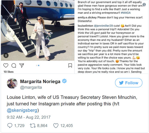 “难道你缴税比我们多?”据《华盛顿邮报》21日报道,美国财政部长姆努钦的夫人林顿周一跟丈夫一起坐政府公务机出行,在社交网上大晒此行穿戴的各种时尚品牌,遭到网友的批评和嘲讽。对此,林顿回帖怒斥网友,声称他们夫妻二人对国家财政的贡献比该网友多得多。
