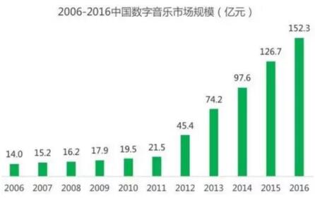 数据显示,2014年中国音乐市场在全球排名第19位,到2015年即暴涨63.8%,升至第14位。2016年中国网络音乐产业行业规模突破150亿元,相比2006年增加了10倍。2017年3月,PFI再发《报告》,中国音乐市场的全球排名已经升至第12位,数字音乐更是排名全球第9,流媒体音乐排名全球第7。