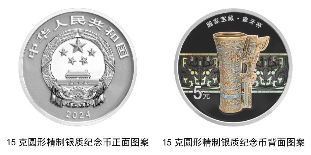 15克圆形银质纪念币背面图案为象牙杯造型,衬以象牙杯局部纹饰,并刊“国家宝藏·象牙杯”字样及面额。