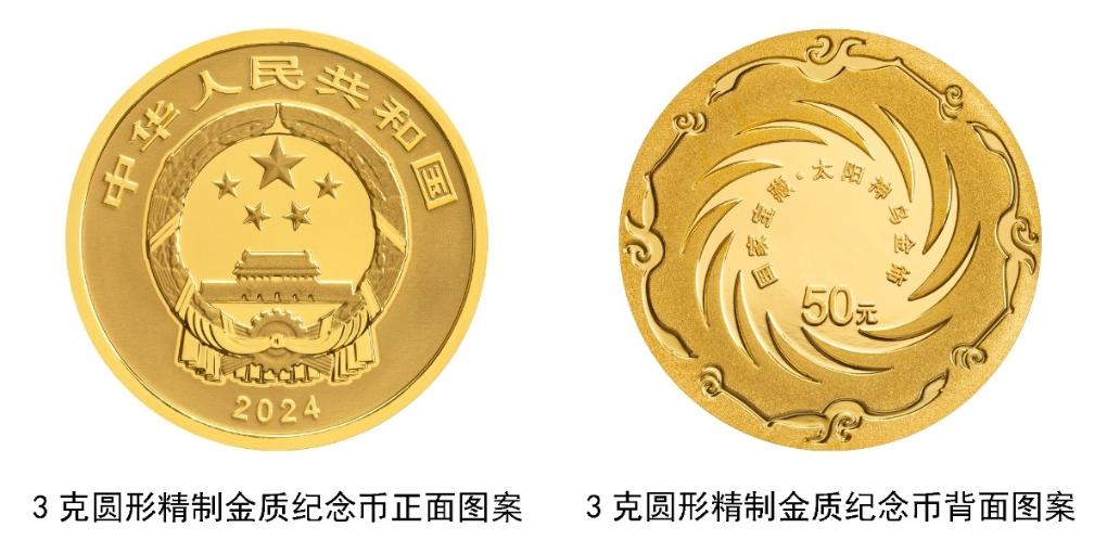 3克圆形金质纪念币背面图案为太阳神鸟金饰造型,并刊“国家宝藏·太阳神鸟金饰”字样及面额。
