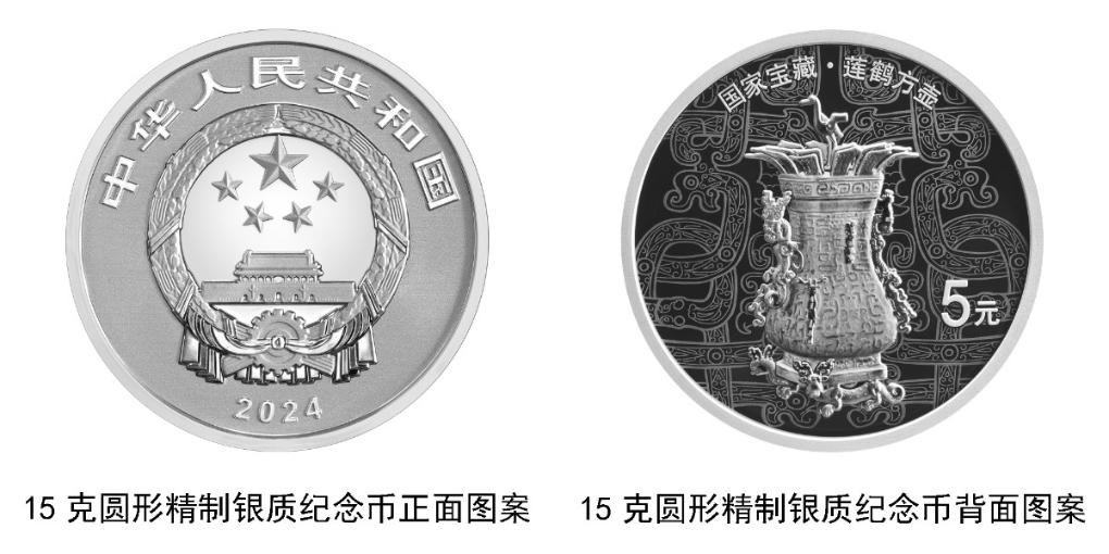 15克圆形银质纪念币背面图案为莲鹤方壶造型,衬以莲鹤方壶局部纹饰,并刊“国家宝藏·莲鹤方壶”字样及面额。