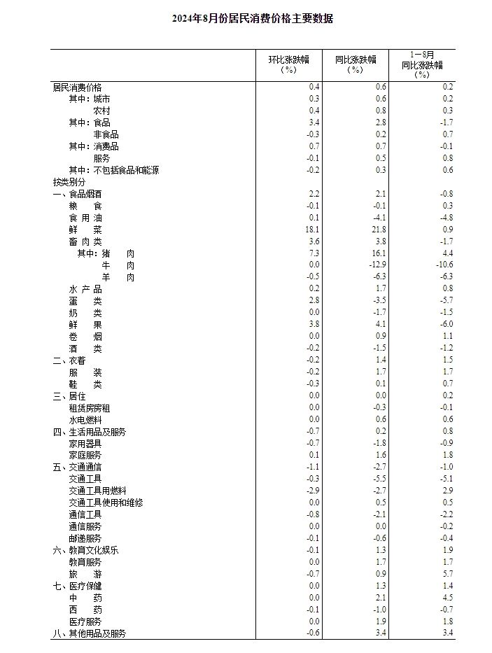国家统计局:2024年8月份居民消费价格同比上涨0.6%
